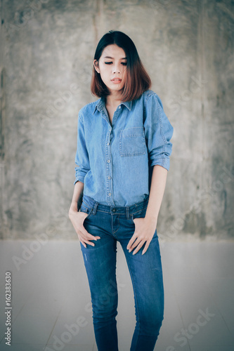 Asian Woman Casual Outfits Standing In Jeans And Blue Denim Shirt